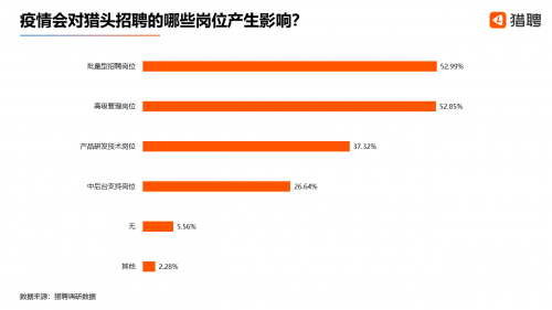 当问及疫情会对猎头招聘的哪些岗位产生影响,52.99%的猎头认为是批量型招聘岗位;52.85%的猎头认为是高级管理岗位;37.32%的猎头认为是产品研发技术岗位。这三大岗位成为受疫情影响最大的岗位。