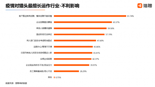 在本次调研中,猎头认为疫情对猎头最擅长运作行业的不利影响主要集中在三方面,即“客户推迟既有招聘,整体招聘节奏变慢”“企业招聘需求萎缩”“候选人跳槽变谨慎”,这三者的得票率为81.74%、65.57%、59.58%。