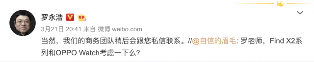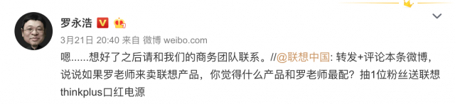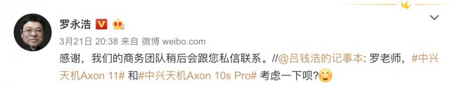 6cu.com查询罗永浩最近一周的微博发现,他有过互动的品牌基本都是硬件产品,包括中兴天机Axon 11、中兴天机Axon 10s Pro,OPPO Find X2系列、OPPO Watch,威马汽车、联想等。