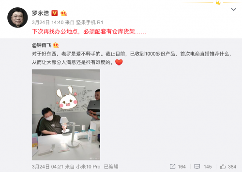 3月24日,@钟雨飞在微博晒出一张疑似罗永浩在为直播带货做准备的照片。照片中罗永浩面前摆着几件小米生态链产品,手中摆弄着米家旗下一款智能床头灯。网友猜测,罗永浩的电商直播首秀或将献给小米。