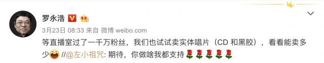罗永浩还在与网友互动中称,“等直播室过了一千万粉丝,我们也试试卖实体唱片(CD 和黑胶),看看能卖多少。”