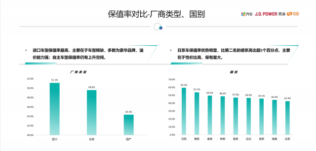 在厂商类别及国别上,相比于合资及国产厂家经营的汽车,进口车型明显保值率最高。其中,日系车保值率优势明显,丰田与本田携手登顶,比第二名的德系高出将近5个百分点。可以看出,进口车型,多数为豪华品牌,溢价能力强,同时对比来看,日系车性价比高,保有量大,适合日常出行使用。