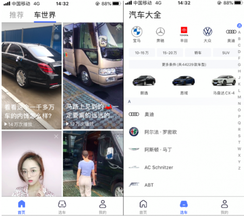 值得注意的是,“有驾”首页中的“推荐版块”,主要是以相关汽车行业的自媒体文章,所有的内容来源于百家号。而“车世界”版块,则主打汽车短视频,内容来源于百度的好看视频。