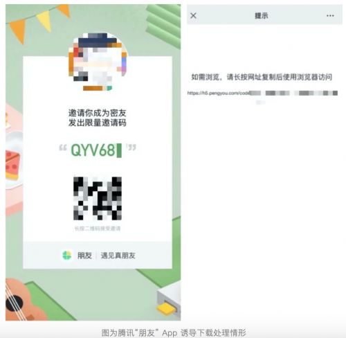 除了上面说到的,还有一种行为:部分第三方 App 通过邀请链接、邀请口令、邀请二维码等方式,涉嫌诱导用户下载 App ,同时可能存在拉取关系链的行为,让访问的用户也没办法知道自己的信息用途。对此类链接,我们不再提供微信内直接打开的服务,用户可以通过“复制链接在浏览器中打开”的形式进行访问这一类 App 。