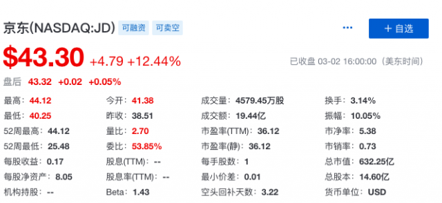 可以说,这份财报不仅仅是对京东单个季度的总结,也是对过去一年京东变革成果的展现。值得注意的是,得益于营收超过预期,GMV以及年活跃用户的持续增 长,京东股价在盘前涨幅一度超过7%。截至美股周一收盘,京东股价报收于43.3美元,涨幅为12.44%,目前总市值约632.25亿美元。
