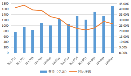 外界的言论并没有让京东放缓变革的脚步,四个季度的财报数据,让投资者看到了对京东的信息。四季度数据显示,京东2019年第四季度净收入为1707亿元人民币(约245亿美元),同比增长26.6%,超出2019年第三季度财报中给出的预期指引上限。同时,这也是京东连续9个季度营收破千亿元。