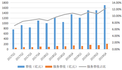根据京东财报公开的信息显示,京东的收入主要来源于两个方面,分别是商品以及服务方面,其中净商品收入为1497亿元,净服务收入为210亿元。从占比上来看,2019年四季度京东净服务收入的占比为12.3%,创下新高。虽然“份量”较低,但已经是连续六个季度占比超10%。