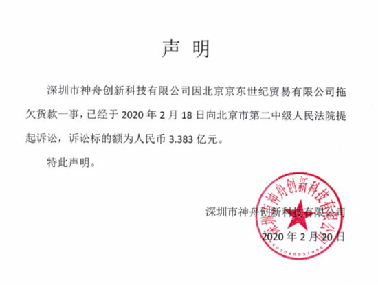 20日下午13点10分,神舟官微宣布正式起诉京东,称已经于2020年2月18日,向北京第二人民中级法院发起诉讼,诉讼标的额为3.383亿元。