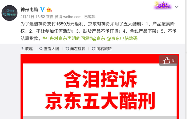 2月21日,神舟再次发声控诉京东,总结了京东“逼迫”神舟支付1559万元返利,采用的“五大酷刑”:1、产品搜索降权;2、不让参加任何活动;3、缺货产品不予订货;4、全线产品下架;5、不予结算货款。