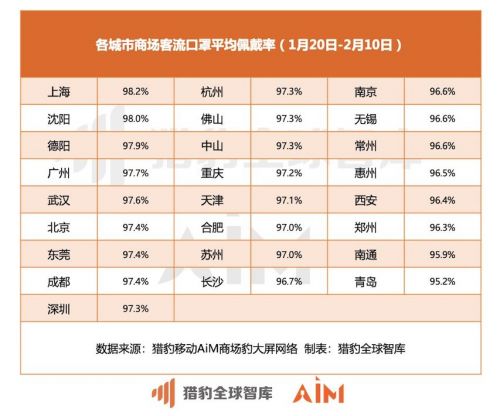 在逛商场的客流中,我们还能够借助“猎豹移动AIM商场豹大屏网络”的大数据看到顾客口罩佩戴率的相关数据。