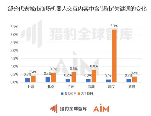 其中,上海上升了33%,北京上升了100%,广州和深圳分别上升200%和300%;疫情中心武汉,顾客在2月10日和机器人交互中含“超市”的占比,是1月20日的15.5倍。