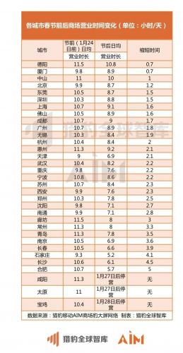 从商场营业时间看,各城市商场日均营业时间在春节之后均有缩短,一线和商业相对发达的城市,缩短的时间较少,在两个小时以内。其中上海缩短了1.6个小时,北京1.2个小时,广州1.8个小时,深圳1.5小时。武汉节前的营业时间较长,节后相对而言也不短,缩短了2.2个小时。
