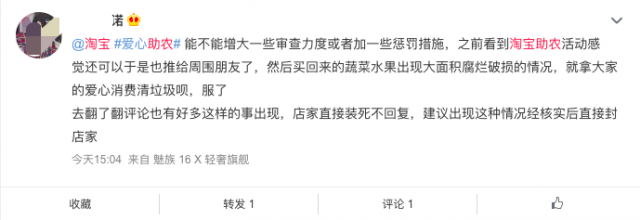 有的网友就在微博上表示,“能不能增大一些审查力度或者加一些惩罚措施,之前看到淘宝助农活动感觉还可以于是也推给周围朋友了,然后买回来的蔬菜水果出现大面积腐烂破损的情况,就拿大家的爱心消费清垃圾呗,服了。”