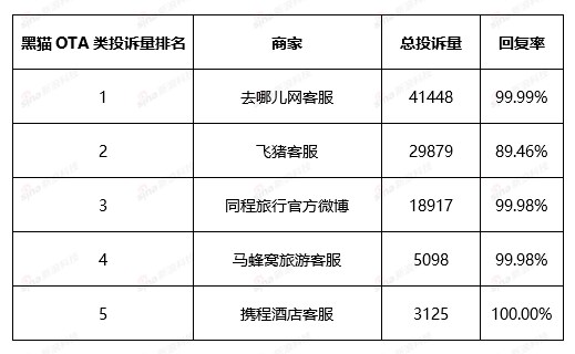 从数据来看,总的来说,OTA 类投诉数量一枝独秀,对投诉的反馈速度还可以,但飞猪的回复率明显低于其他同业。