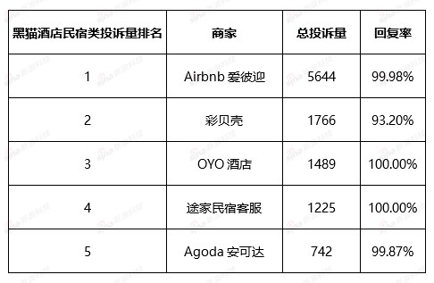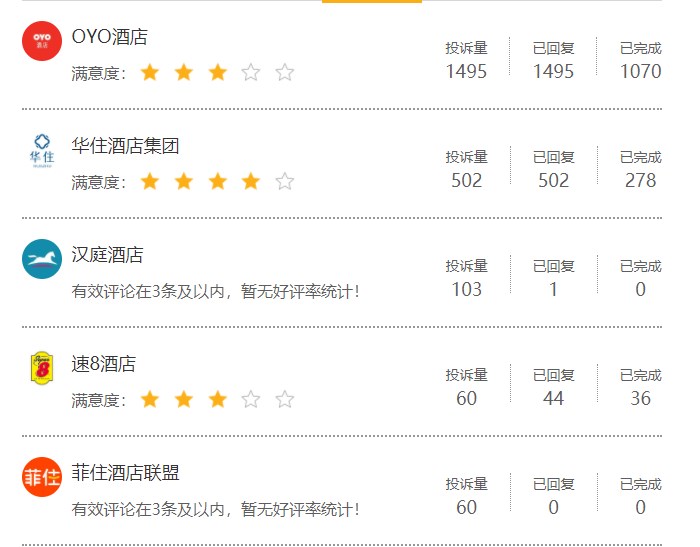 从黑猫投诉平台的数据看,在酒店民宿类中,Airbnb 爱彼迎的投诉量明显较多,可能和体量也有一定的关系。按照品牌排名,OYO 酒店的投诉数量明显超出其他。酒店民宿们的优点是投诉回复率普遍比较高,希望回复率能和解决问题的效率成正比。