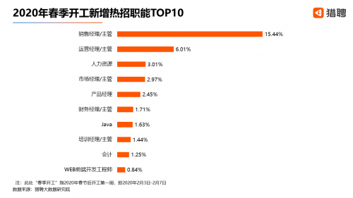 从2020春节后开工一周猎聘平台新增的十大热招职能来看,销售经理/主管以15.44%的占比位居第一。在疫情下的特殊时期,挺过这段艰难岁月、活下去才是大多企业的当务之急,而销售是帮助公司变现的职能,因而这个职能此时尤为重要。