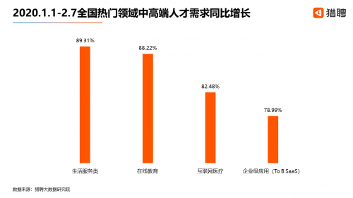 以上四个领域在2020年1月到2月初以来的中高端人才需求均获得了迅速增长,同比增长均超78%,其中生活服务类领域最高,同比增长为89.31%;在线教育为88.22%,位居第二;互联网医疗以82.48%的同比增长位居第三;企业级应用(To B SaaS)为78.99%,位居第四。