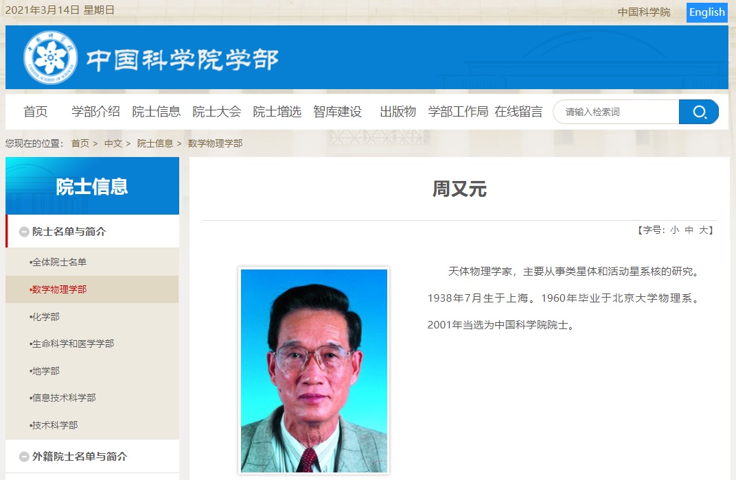 中国科学院网站显示,周又元院士为天体物理学家,主要从事类星体和活动星系核的研究。1938 年 7 月生于上海。1960 年毕业于北京大学物理系。2001 年当选为中国科学院院士。