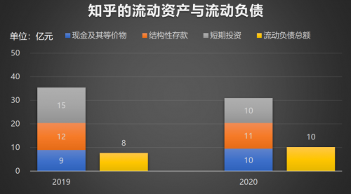 截止2020年12月31日,知乎的资产负债表上躺着37亿元流动资产,其中20亿是现金和短期存款,10亿是短期投资,应付它的负债戳戳有余。换句话说,它并没有挥霍一级市场融来的钱,而是一直在伺机而动。