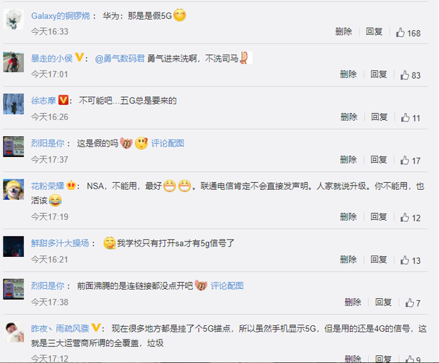 对于两家的回复,有网友评论称:“我学校只有打开sa(独立组网)才有5g信号了。”有网友晒图表示质疑。