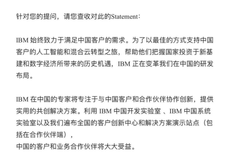 关于此次关闭,IBM 官方的说法也是为了尽快实现研发转向——“为了以最佳的方式支持中国客户的人工智能和混合云转型之旅……IBM 正在变革我们在中国的研发布局”。