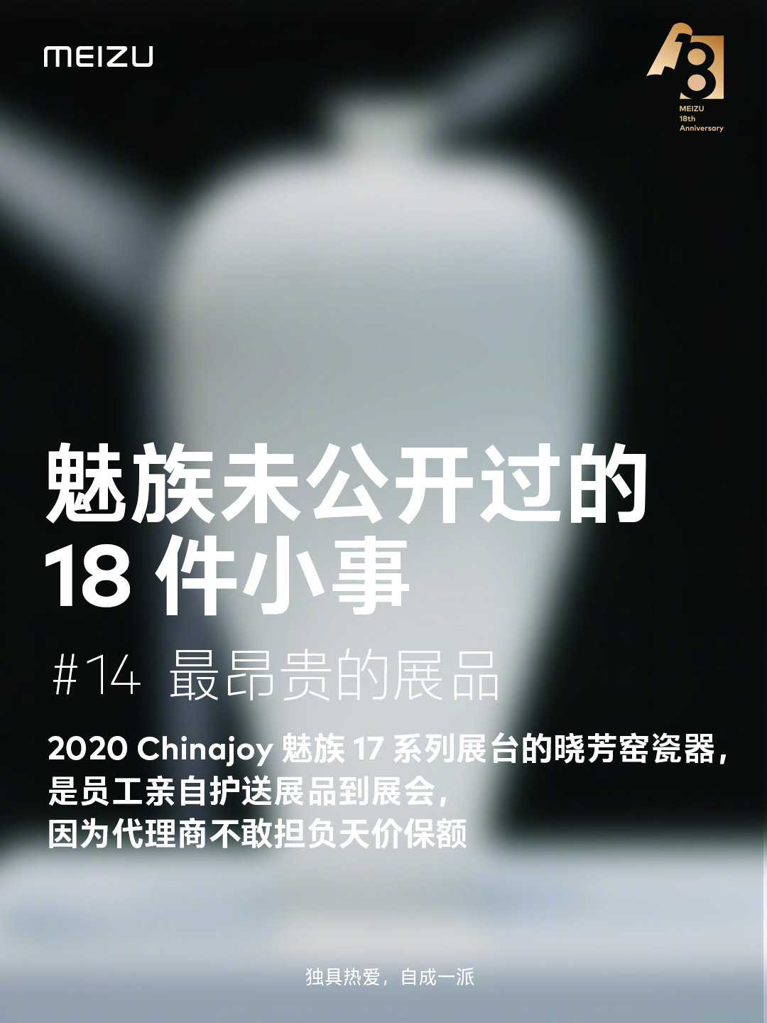 另外,魅族表示其最昂贵的展品是 2020 Chinajoy 魅族 17 展会前的晓芳窑。据介绍,该展品是由他们员工亲自护送到展会,因为代理商不敢担负天价保额。