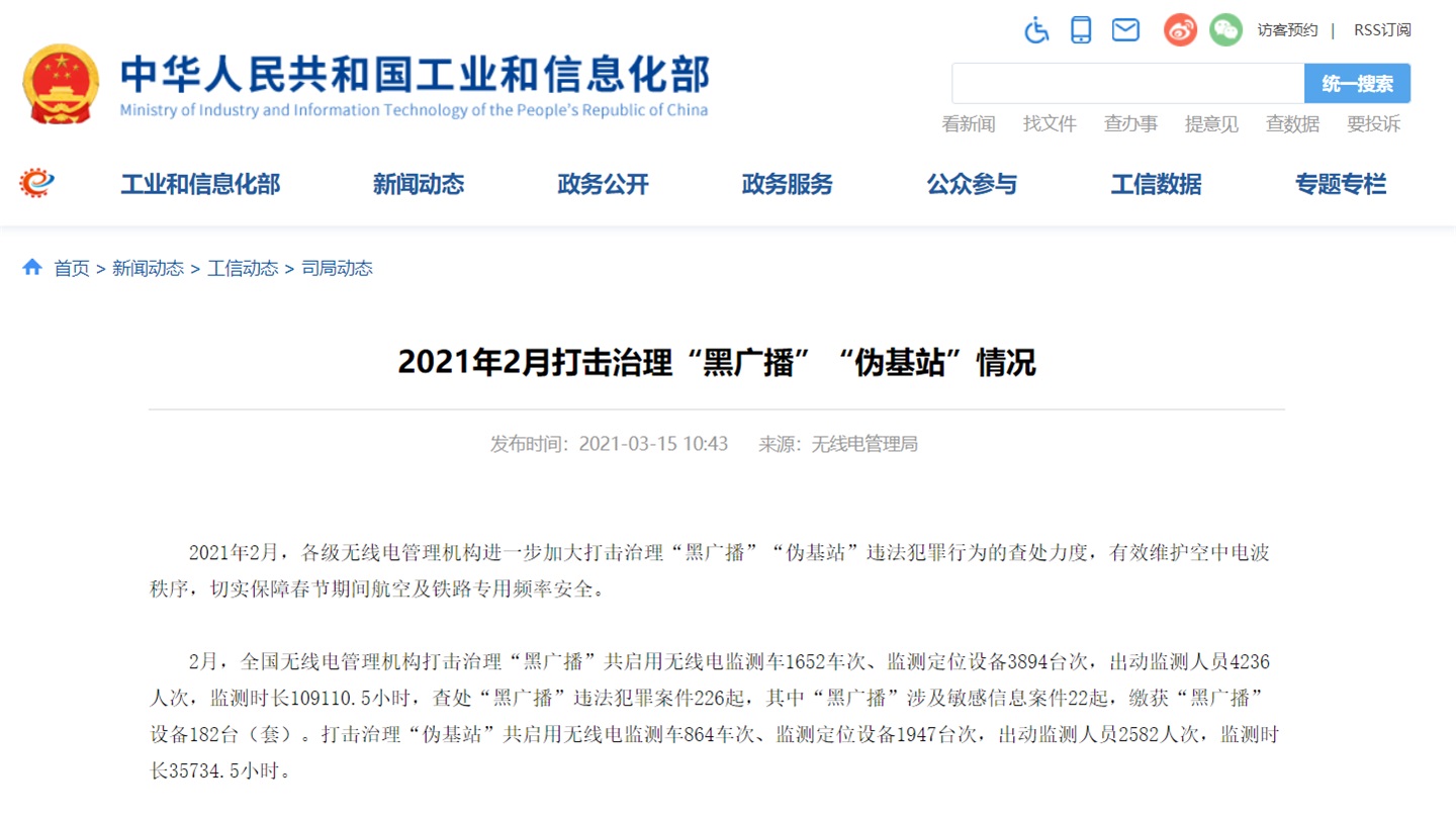 3月15日消息 工信部发布无线电管理局今日发布 2021 年 2 月打击治理 “黑广播”“伪基站”情况。报告显示,全国无线电管理机构当月加大了监测以及治理 “黑广播”“伪基站”违法犯罪行为的查处力度,有效维护空中电波秩序,切实保障春节期间航空及铁路专用频率安全。