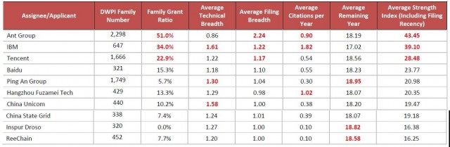 文章引用国际权威数据库德温特世界专利索引(简称:DWPI)区块链专利 “平均实力指数”。指数显示,蚂蚁集团在授权专利、覆盖率和引用率方面表现突出,总得分最高。IBM、腾讯分列二、三位。百度虽然专利的规模小,但是综合指数较高,排名第四。