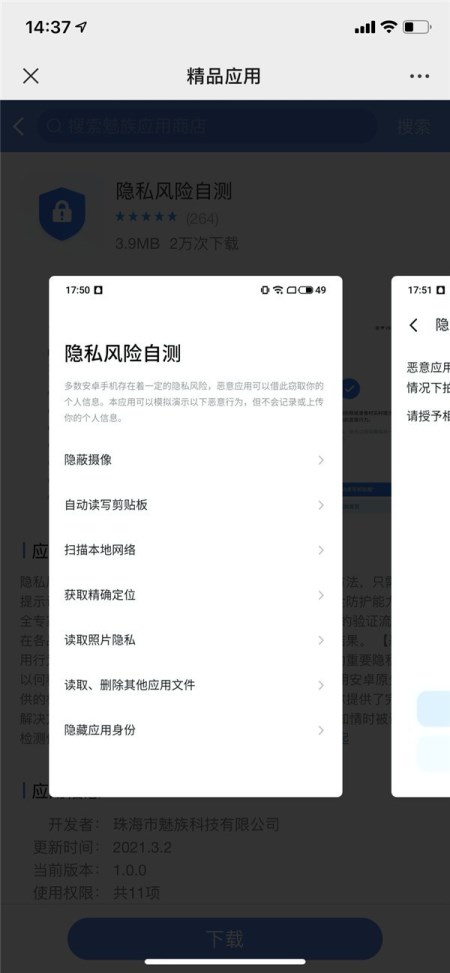 在魅族 18 发布会上,魅族公布了自己研发的一款 App——隐私风险自测,大小仅 3.9MB,可供安卓用户检测自己手机的隐私防护性能。