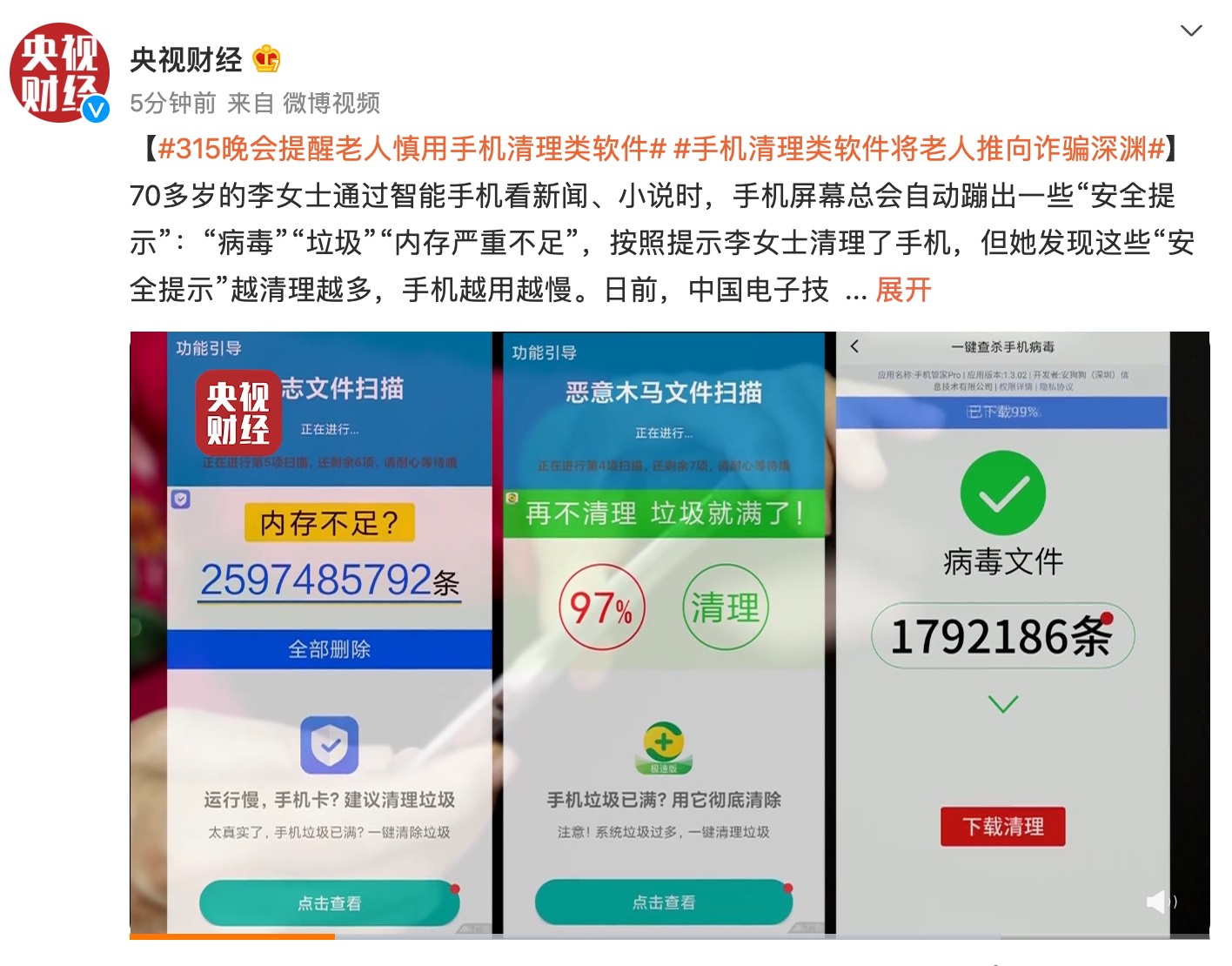 15 日消息 在今晚的 315 晚会上,央视曝光了手机上清理类软件给老年人带来的困扰。