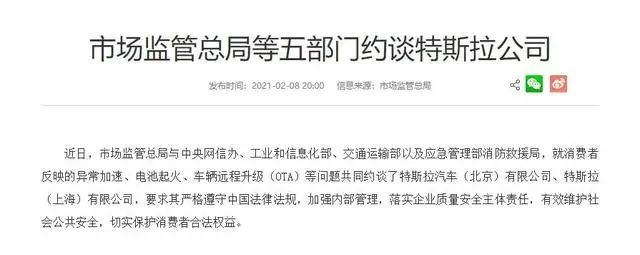 今年 2 月,国家市场监督管理总局与中央网信办、工信部、交通运输部以及应急管理部消防救援局,就消费者反映的异常加速、电池起火、车辆远程升级(OTA)等问题共同约谈了特斯拉汽车(北京)有限公司、特斯拉(上海)有限公司,要求其落实企业质量安全主体责任,维护社会公共安全,切实保护消费者合法权益。