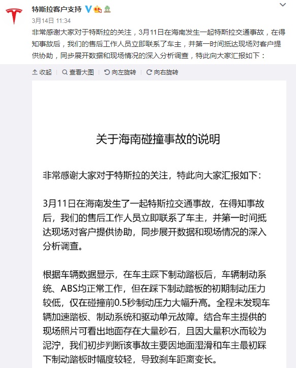 而在近日的海南特斯拉车主刹车失灵事件中,特斯拉则回应称,事故原因为地面湿滑,踩制动踏板较轻,导致制动距离变长,才造成了碰撞事故的发生。