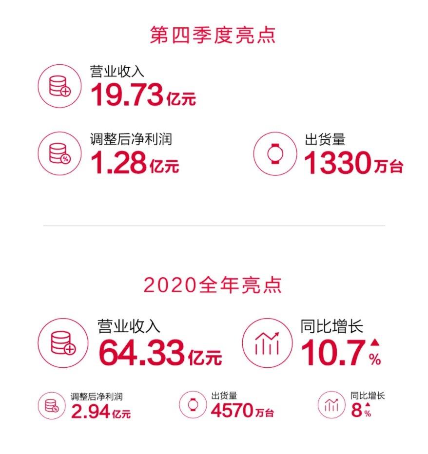 2020 年全年,华米科技营业收入 64.33 亿元,同比增长 10.7%。调整后的净利润 2.94 亿元,全年出货量 4570 万台,同比增长 8%。