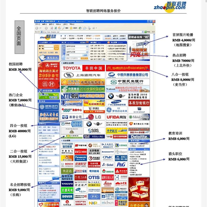 据公开资料显示,2011 年智联招聘首页热门企业的广告位便已经卖到了 7 万一周。目前智联招聘以套餐的形式售卖广告,分季度、半年、全年。年度会员的费用在 2500 左右,广告费用仍是每周计算,价钱在 500-10 万不等。企业方可以电话与智联招聘的销售,与其沟通并确定相应的信息方位和费用,然后签署合作协议,签署协议并付款后便可以登上广告。在前程无忧中可以买到知名企业板块的广告,其价格在每周三千到一万不等。