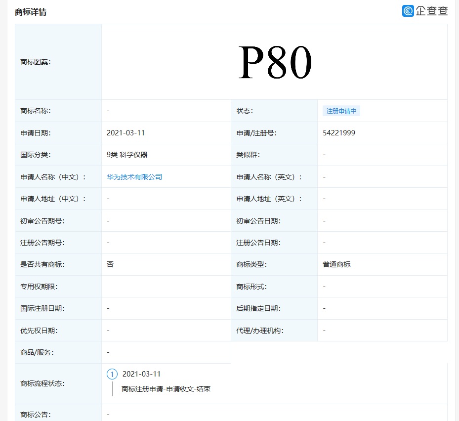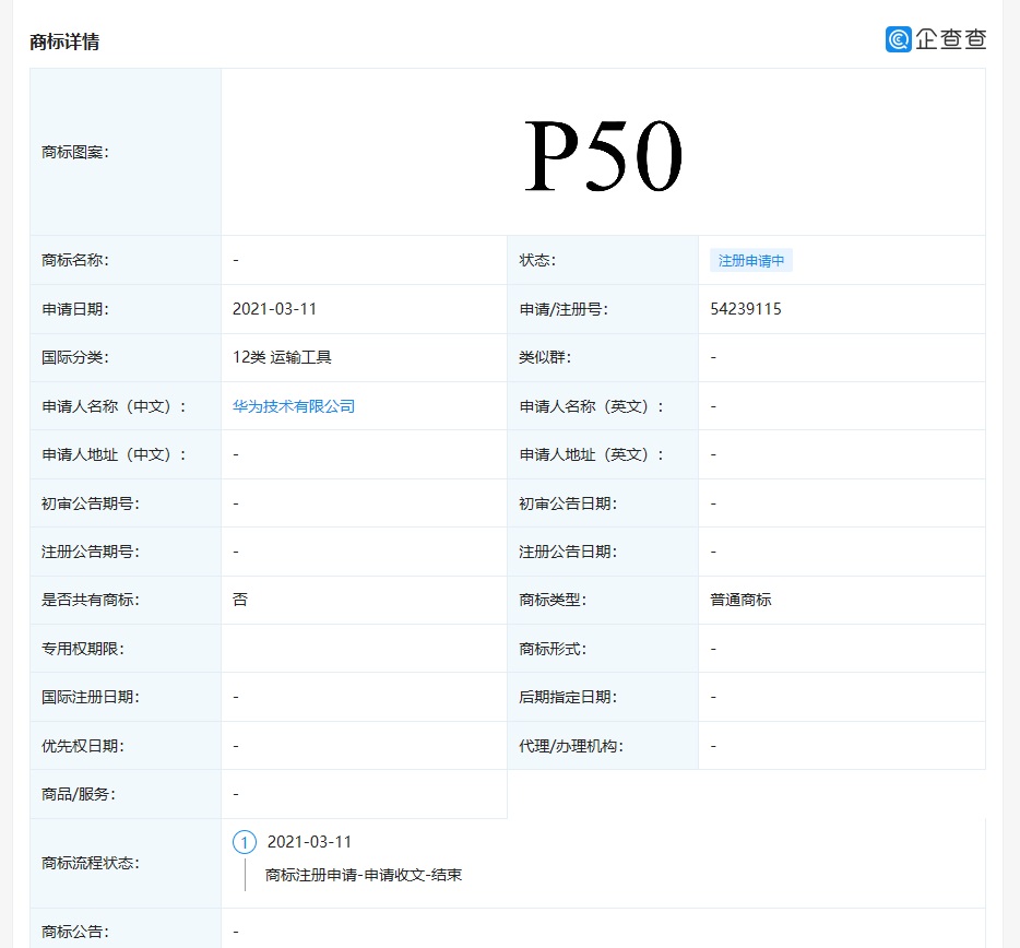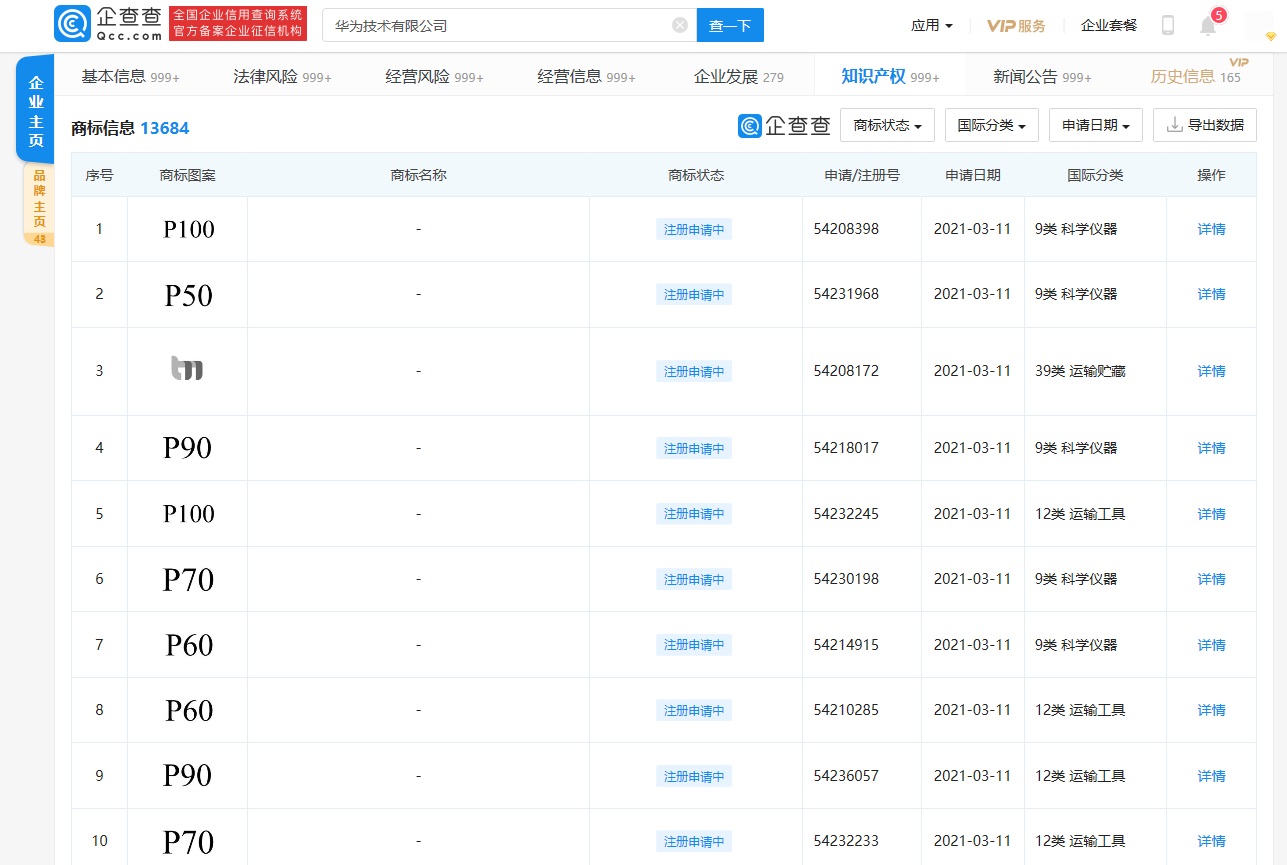 企查查 App 显示,华为技术有限公司申请注册 “P50”、“P60”、“P70”、“P80”、“P90”、“P100”等商标,国际分类涉科学仪器、运输工具,商标状态为 “注册申请中”。