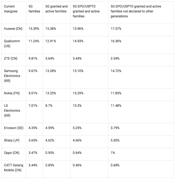 ,今年 2 月份,国际知名专利数据公司 IPLytics 发布了《5G 专利竞赛的领跑者》报告,报告显示,华为以 15.39% 的专利申请量位居第一,高通以 11.24% 占比位居第二,中兴通讯以 9.81% 占比位居第三。