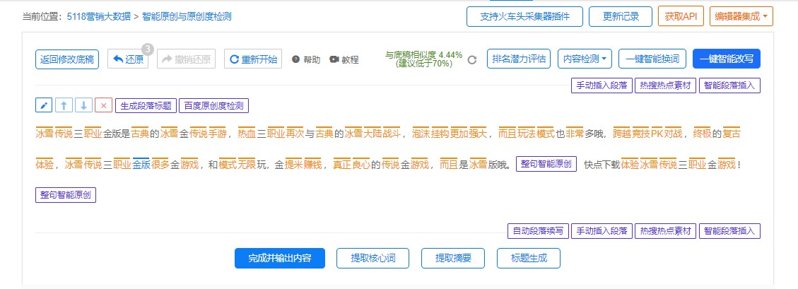 老铁小编回答:伪原创用5118的工具,做内容的智能原创还不错,像这种将文案放进去然后点击一键智能改写就行,还有多个模型可以选择看自己需求操作就可!