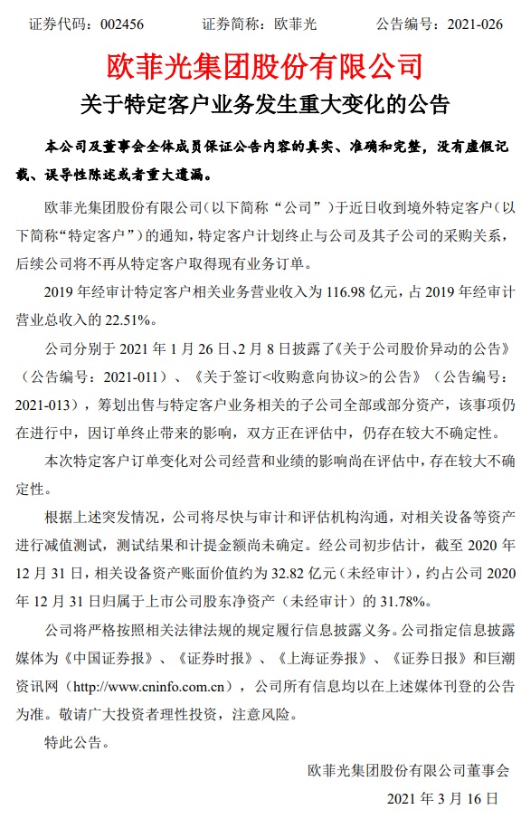 3 月 16 日消息 欧菲光今晚发布公告称,某个占其总收入 22% 的特定客户计划终止与公司及其子公司的采购关系,后续公司将不再从特定客户取得现有业务订单。