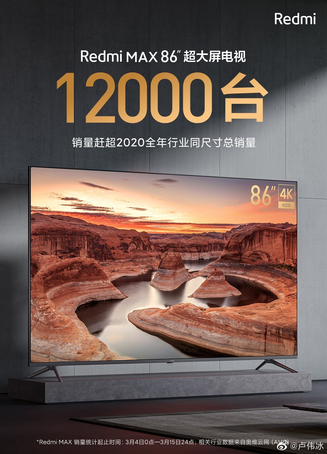今日,小米集团副总裁,中国区总裁,红米 Redmi 品牌总经理卢伟冰宣布,Redmi MAX 86 英寸销量突破 12000 台,赶超 2020 全年同行业同尺寸总销量。