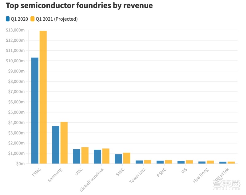 ▲ 2020 Q1 及 2021 Q1 营收预测全球前十大晶圆代工厂(图源 - CNBC,数据来源 - TrendForce)