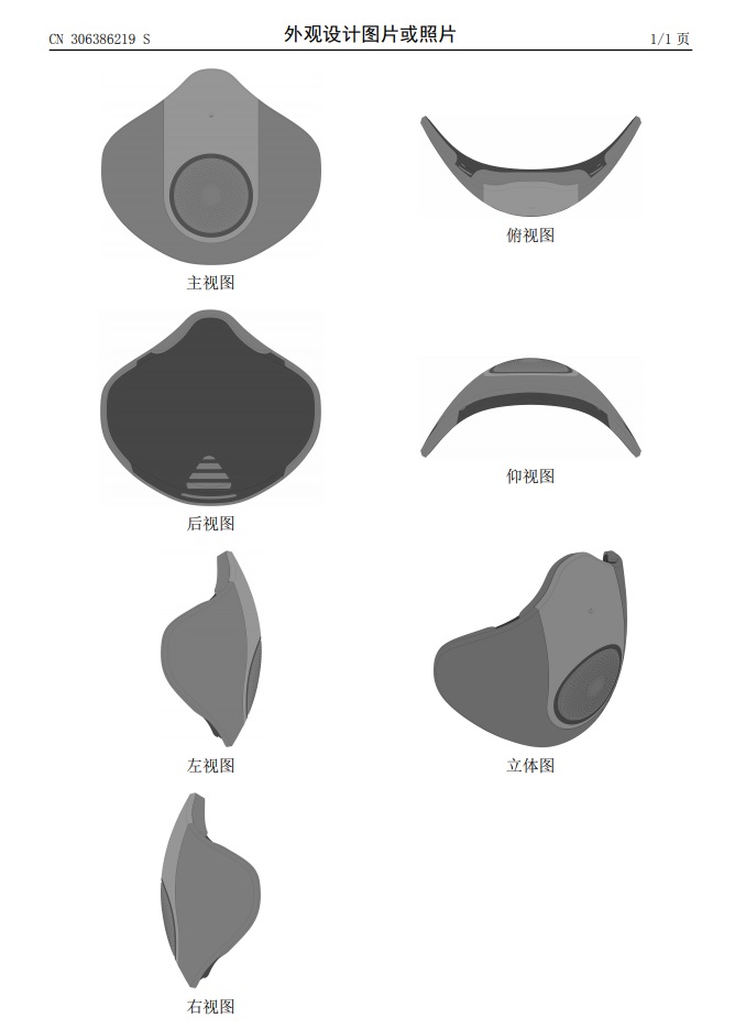 从图中可以看出,该口罩外观专利在正前方有一个圆形设计,似乎是一个通风口或是某种电动设备,口罩整体偏厚。