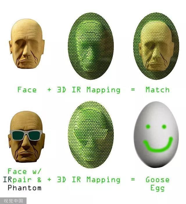 因为很多面部识别技术使用红外(不可见)光识别,它们通过突出红外点映射网格,这些算法创建一个人脸的 3D 模型,像一个雷达地形图。
