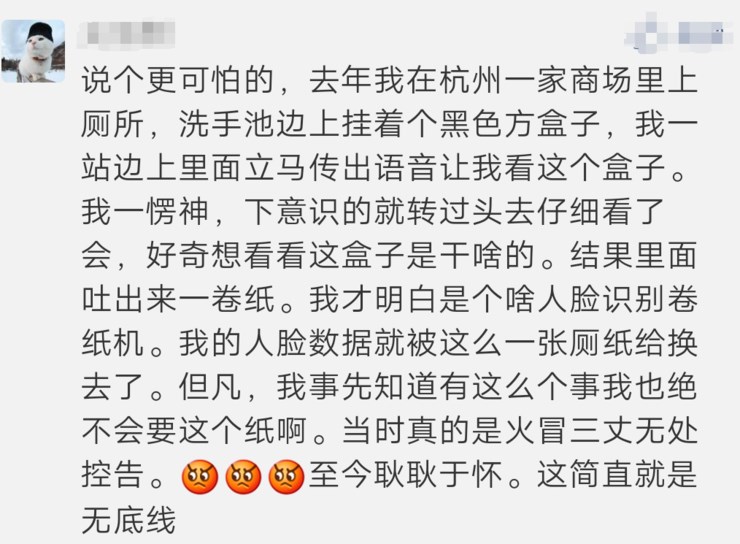 说实话我很想去刷脸领纸,毕竟这个时候我快憋不住了,但是我又固执地不想人脸信息被采集,因为我曾在网上看到过: