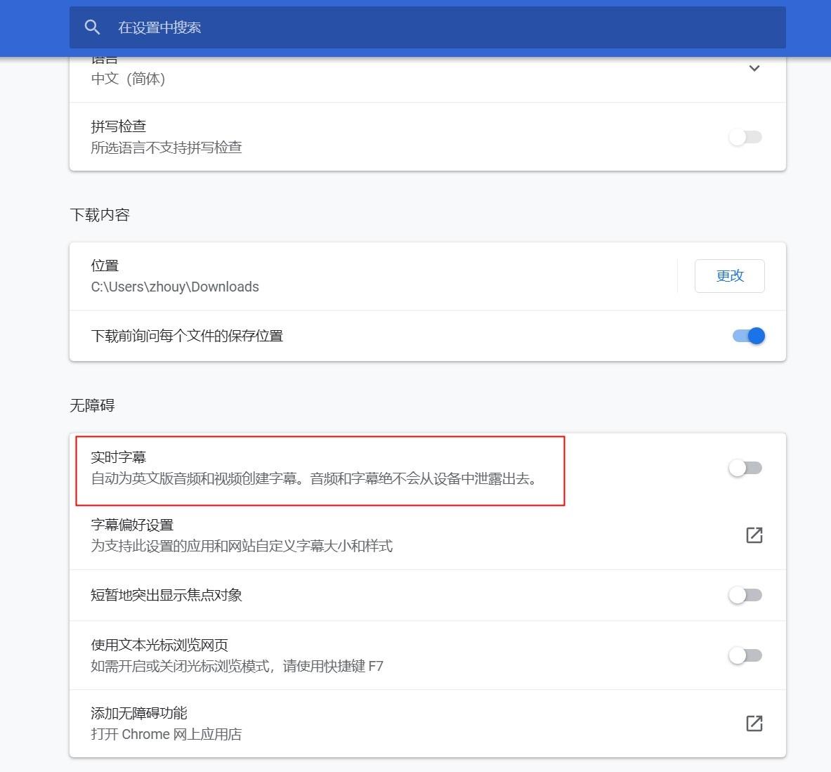 用户可以通过进入 “设置”,然后是 “高级”部分中的 “无障碍”来启用实时字幕。如果没有看到该功能,尝试手动更新并重新启动浏览器)。当首次开启该功能时,Chrome 浏览器将快速下载一些语音识别文件,然后当浏览器下次播放人们说话的音频时,应该就会出现字幕。