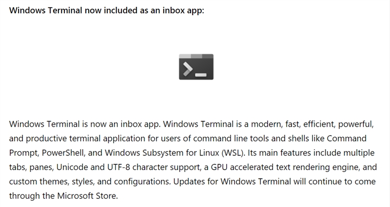 除了上述新特性,相信下面这项新变化更受开发者欢迎——Windows Terminal 将会成为内置应用被预装至 Windows10,变成了像「记事本」一样非常方便使用的应用程序。毕竟现在如果需要使用 Windows Terminal,需要从 Microsoft Store 安装或从 GitHub 发布页下载安装。相比之下,对于使用者来说,内置无疑更为方便。