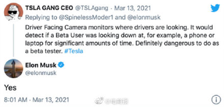 据媒体报道, 近日,马斯克在推特发布消息称,将收回一些车主的FSD beta版的试用权限。原因是这些车主在使用FSD beta功能时,没有对道路情况给予足够的关注。马斯克称,之所以是beta版本,就意味着还处在测试阶段,虽然至今没有发生任何事故,但不能完全不管不顾。因而对于这些不够关注路况的车主,特斯拉将会收回FSD beta版本的试用权限。有用户向马斯克询问,特斯拉的车内摄像头,可以检测车主的目光?对此,马斯克直接回答“Yes”。这也是特斯拉官方首次承认,通过车内摄像头来监视驾驶员。