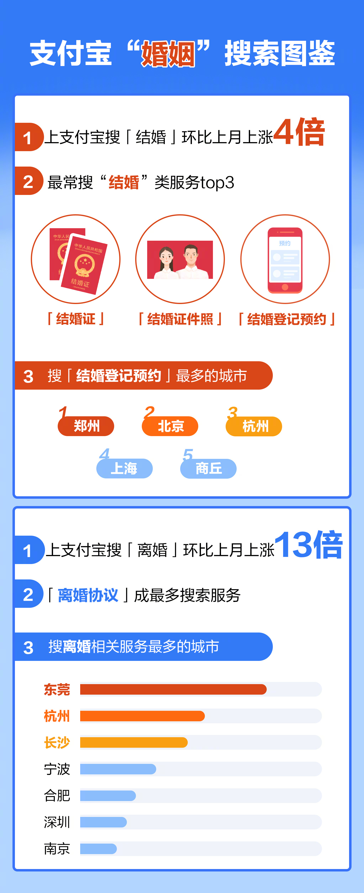 图鉴显示,结婚登记依然火爆。据该图鉴,本月支付宝上 “结婚”类服务搜索量环比上月增长 4 倍,郑州、北京、杭州、上海、商丘成搜 “结婚登记预约”最多的城市。同时,搜 “离婚”相关服务的人数也较上月增长 13 倍,其中 “离婚协议”服务最受关注。