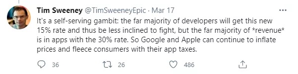 对于两家公司毫无诚意的政策,Epic Games CEO Tim Sweeney 曾在推特发文,指责其 “自私自利”。