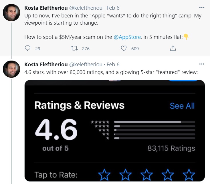 Eleftheriou 发现,这些盗版应用会购买用户评论、星标,以提升它们在 App Store 排名。