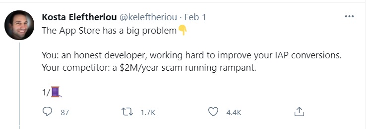 Eleftheriou 在社交媒体上曝光了 APP Store 存在监管不力的种种现象,并再次引起了开发者们对 “苹果税”的声讨。